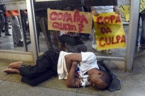 A beggar sleeps at the bus station as demonstrators heading for a protest in front of the Nacional Mane Garrincha against the upcoming FIFA World Cup Brazil 2014 hold placards that read „Cup, for whom?” and „Cup of guilt”, during the „International Day of World Cup Resistance” in Sao Paulo, Brazil on May 15, 2014. AFP PHOTO/Evaristo SA